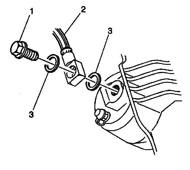 5. Install the brake hose to caliper bolt (1) with 2 new copper washers (3) and the brake hose (2) to the caliper.
