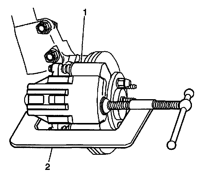 3. Install a C-clamp (2) over the body of the brake caliper, with the C-clamp ends against the rear of the caliper body and the outboard disc brake pad.