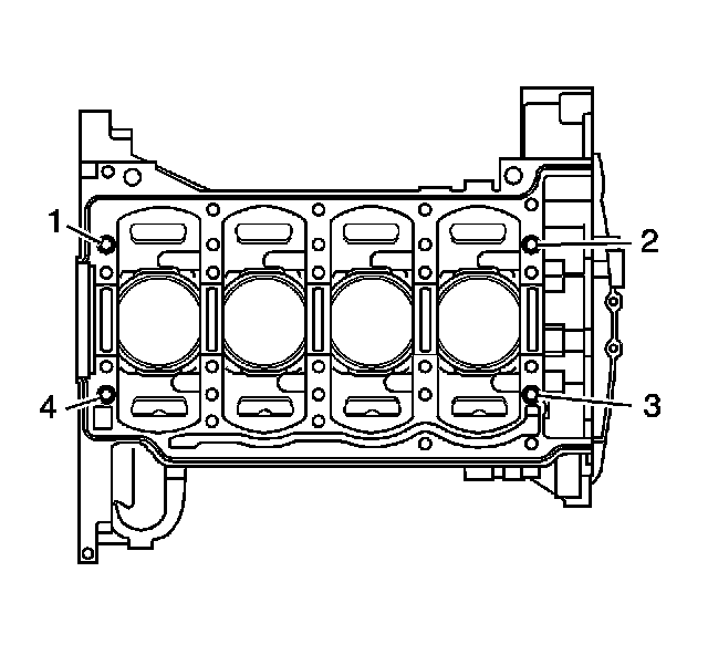 Install the fixture plate (3), bolts (1), and bushing (2) onto the engine block deck.Position the fixture plate and bushing over the hole that is to be repaired (4).