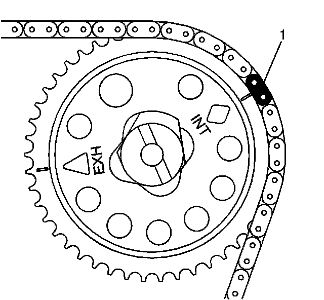 7. Ensure that the INT diamond on the intake camshaft sprocket is aligned with the uniquely colored link at (1) at the 2 o'clock position.