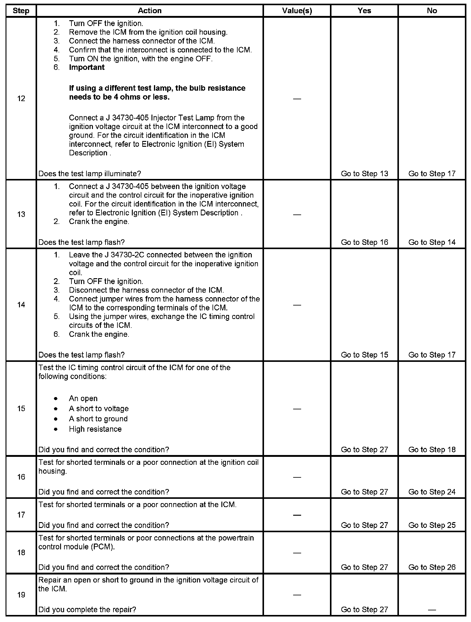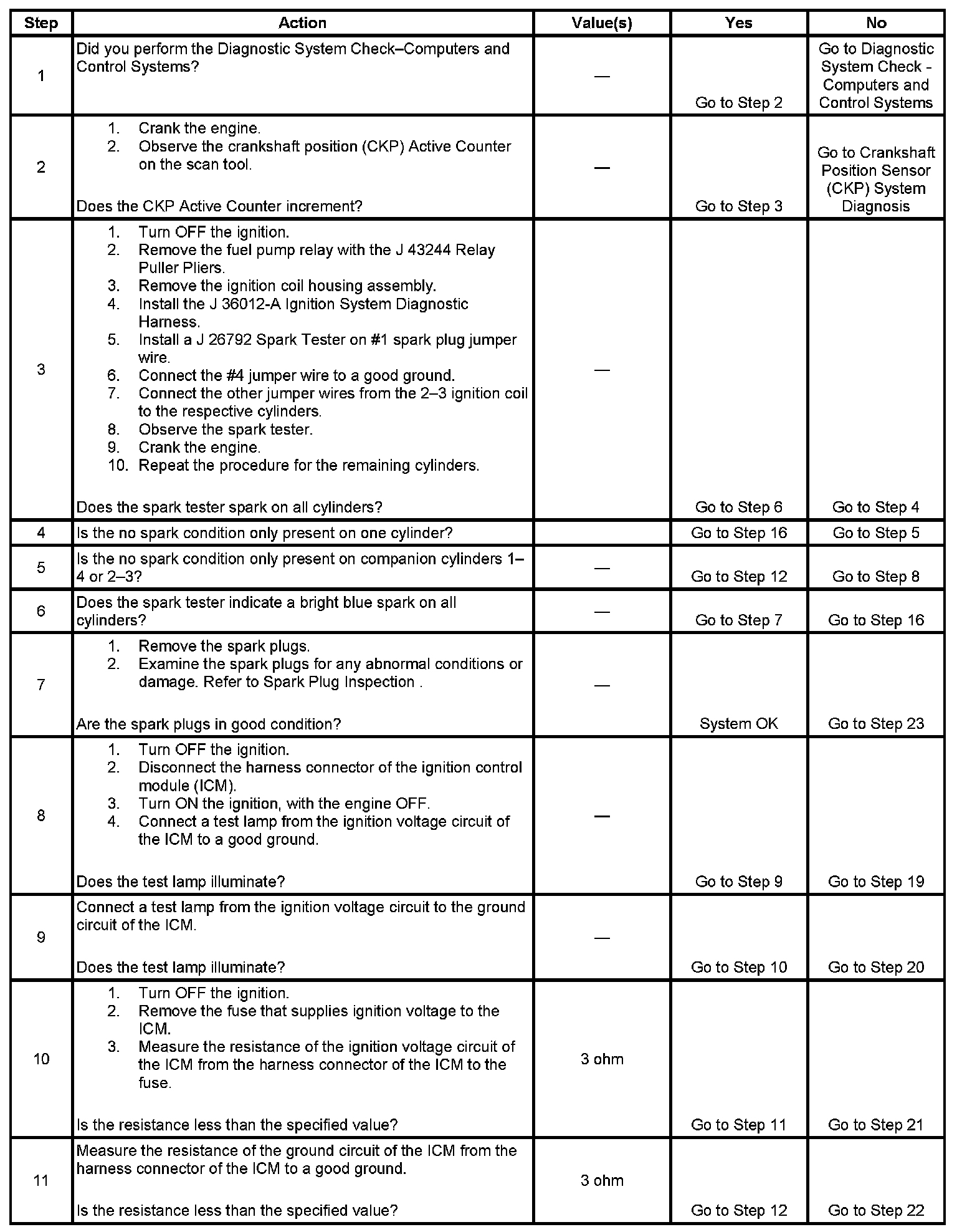 Each ignition coil supplies secondary voltage to a pair of spark plugs. This is called a waste spark ignition system. The powertrain control module (PCM) supplies a signal on each of the ignition control (IC) timing control circuits to the ignition control module (ICM). The ICM fires the correct ignition coil at the correct time based on the signals. The ICM detects if cylinder 1 or cylinder 3 is on the compression stroke by sensing the secondary voltage and polarity of each side of the ignition coil. The ICM detects this voltage with sensing circuitry integrated into each ignition coil. The higher voltage is on the compressing cylinder. This is called compression sense ignition. The ICM provides a synthesized cam signal to the PCM based on these inputs. The PCM uses the cam signal to synchronize fuel injection.