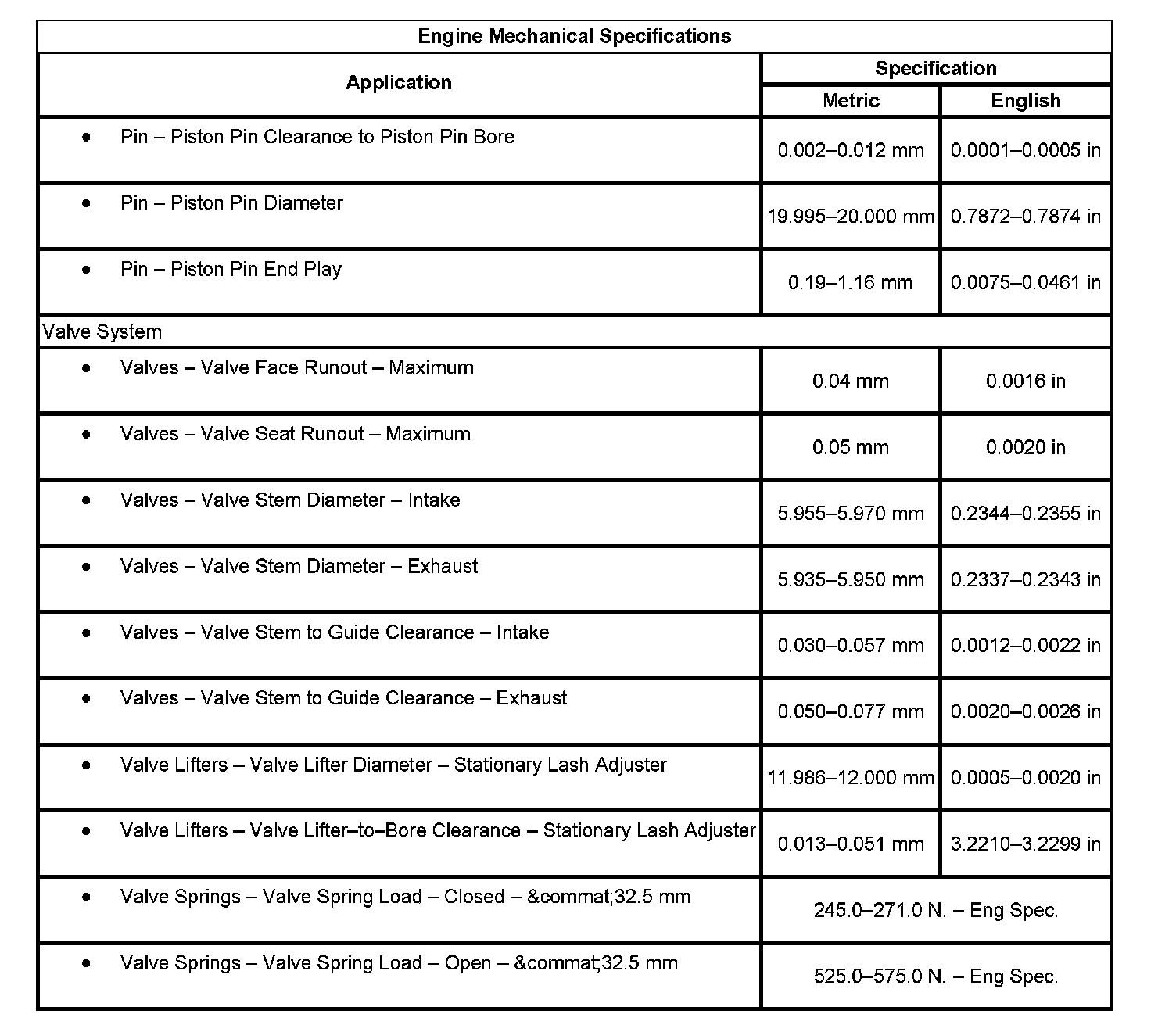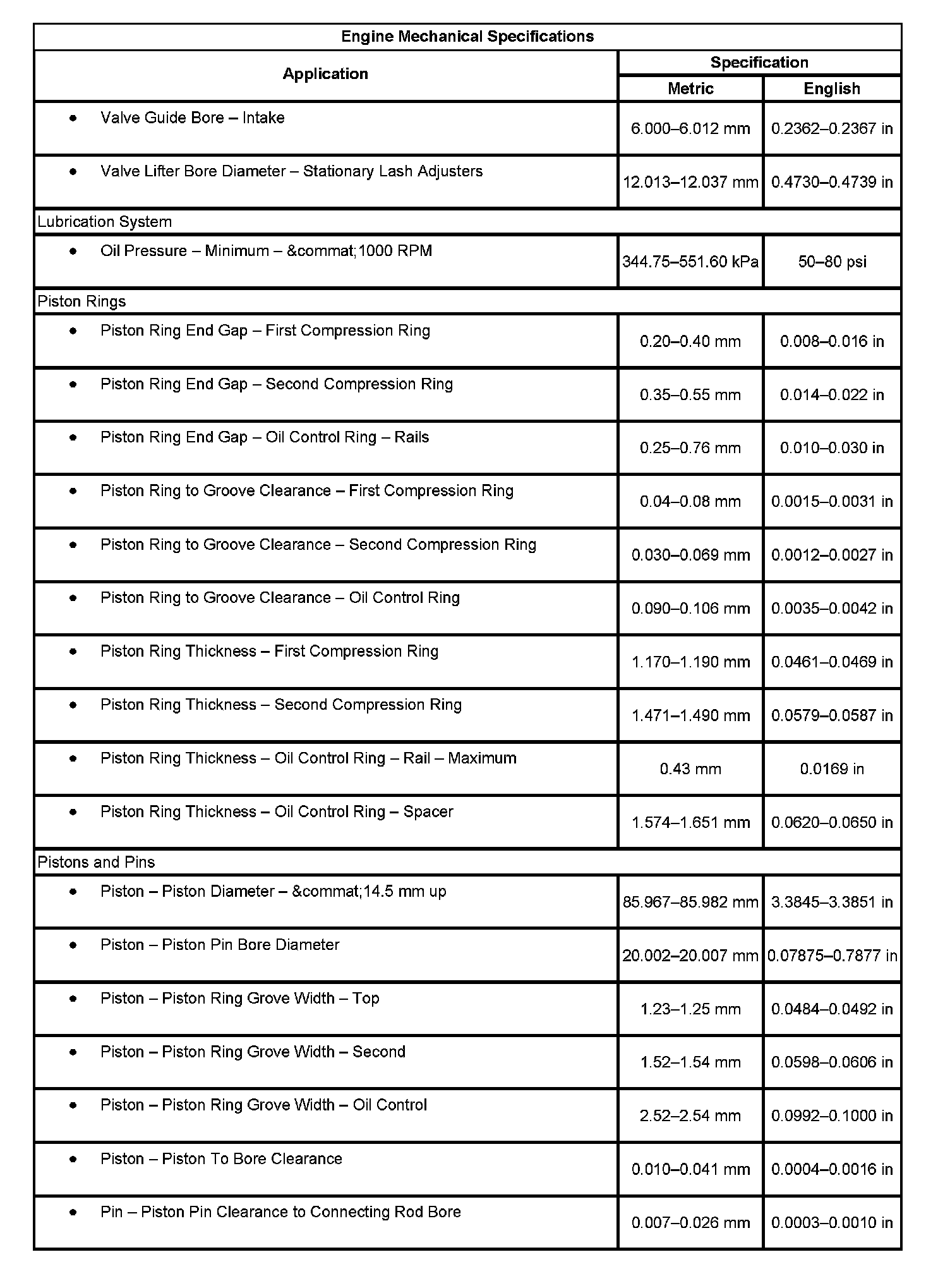 Engine Mechanical Specifications