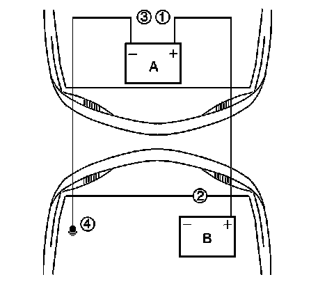 8. The final connection is made to a heavy, unpainted metal engine part (4) of the vehicle with the discharged battery.This final attachment must be at least 46 cm (18 in) away from the dead battery.