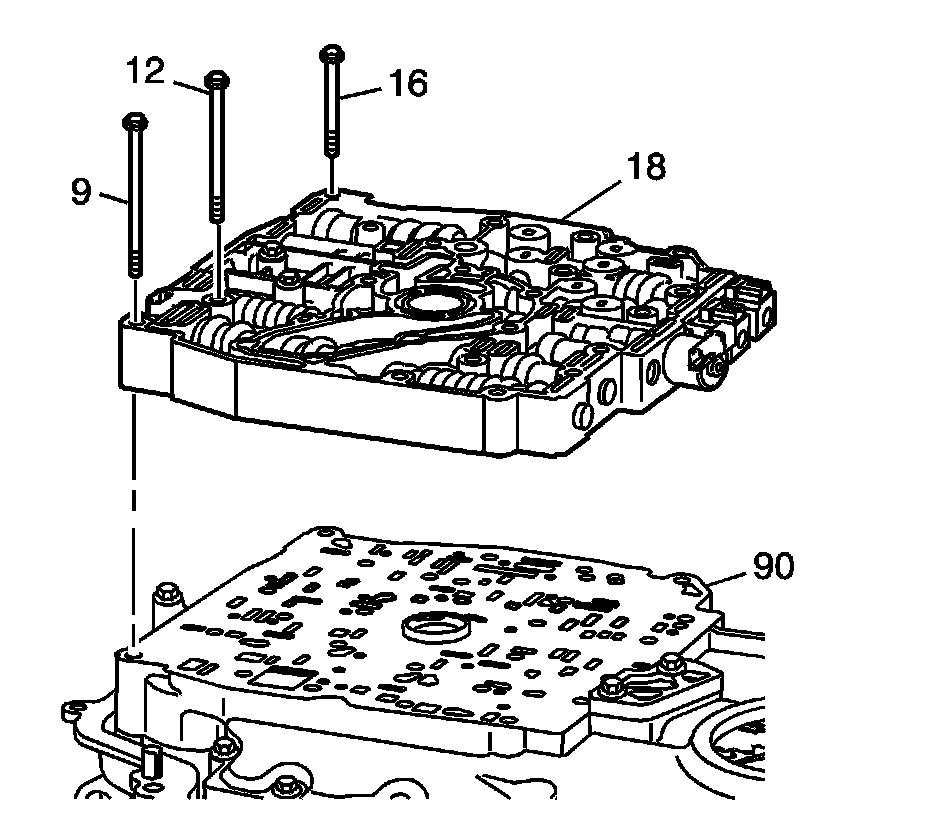 6. Remove the remaining control valve body bolts (9, 12, 16) and remove the control valve body assembly (18).