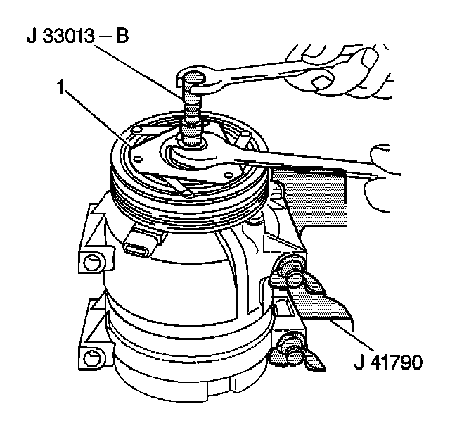 6. Remove the hub and drive plate assembly (1) by turning the center screw into the body of the J 33013-B and against the A/C compressor shaft.