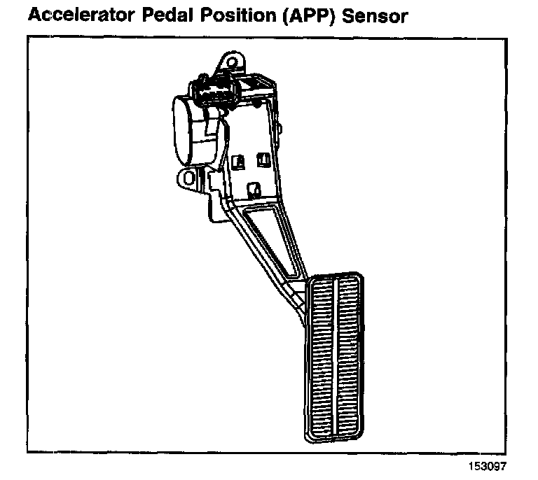 ACCELERATOR PEDAL POSITION (APP) SENSORThe accelerator pedal position (APP) sensor is mounted on the accelerator pedal assembly. The APP is actually 3 individual accelerator pedal position sensors within 1 housing. Three separate signal, low reference, and 5-volt reference circuits are used in order to connect the APP and the TAC module. The APP sensor 1 voltage should increase at the same time that the accelerator pedal is depressed, from below 1 volt at 0 percent pedal travel to above 2 volts at 100 percent pedal travel. APP sensor 2 voltage should decrease from above 4 volts at 0 pedal travel to below 2.9 volts at 100 percent pedal travel. APP sensor 3 voltage should decrease from above 3.8 volts at 0 pedal travel to below 3.1 volts at 100 percent pedal travel.