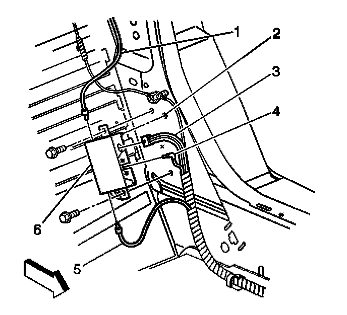 5. Remove the screws retaining the antenna module (6) to the lock pillar.