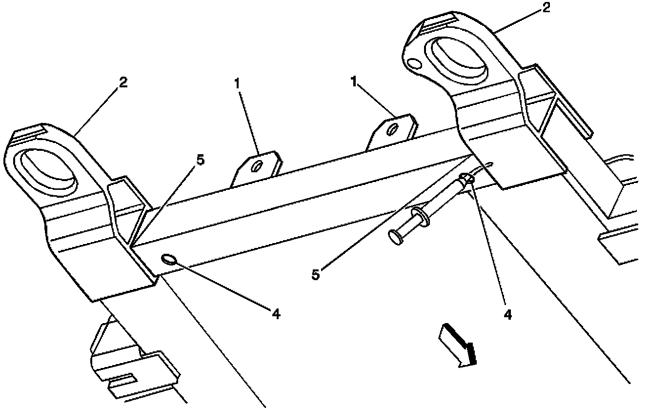 At the location (5) where there is a gap between the rear body mount brackets and the frame rear crossmember, insert the syringe tip and inject approximately 10 ml of threadlocker material into each gap.
