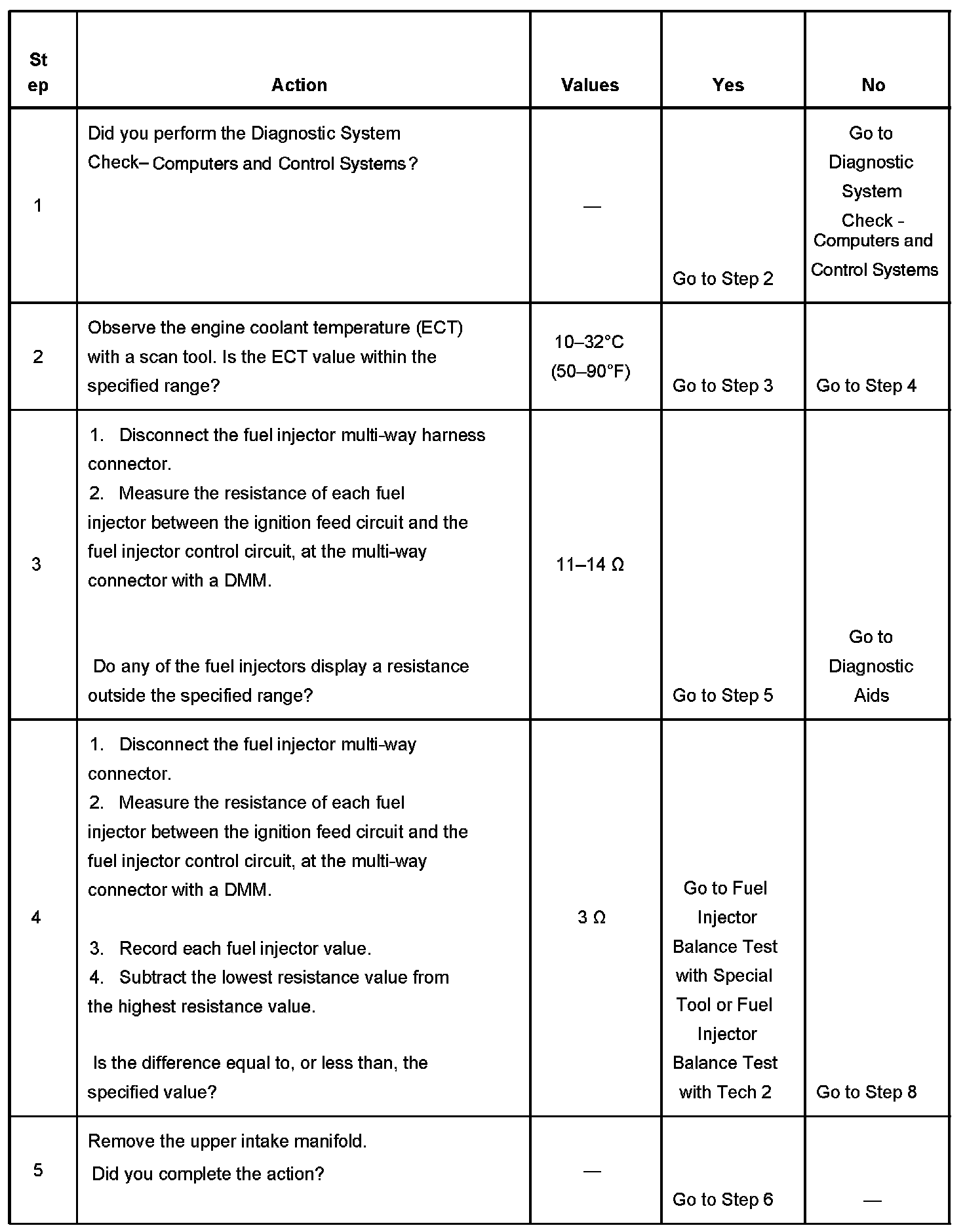 - If the fuel injector coil test does not isolate the condition perform the fuel injector balance test. Refer to Fuel Injector Balance Test with Special Tool or Fuel Injector Balance Test with Tech 2. Component Tests and General Diagnostics Component Tests and General Diagnostics