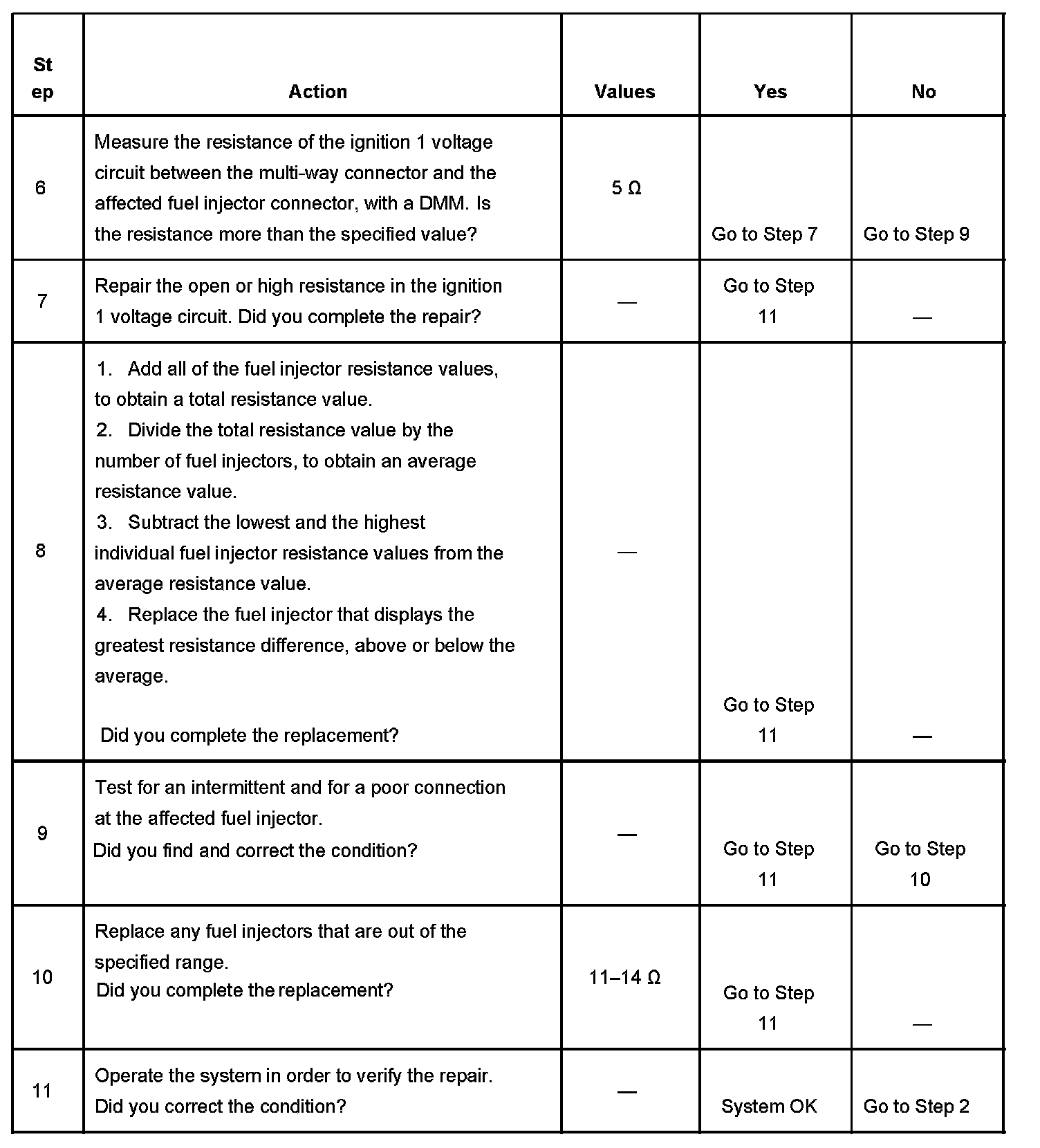 3. This step tests each fuel injector resistance within a specific temperature range. If any of the fuel injectors display a resistance outside of the specified value, replace the fuel injector.