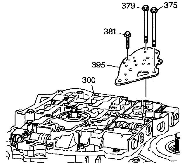 3. Remove the control valve body bolts (375, 379, 381) that mount the fluid pressure manual valve position switch to the control valve body (300).