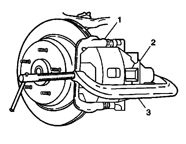 9. Remove the brake hose-to-caliper bolt (1) from the caliper. Discard the 2 copper brake hose gaskets (3). These gaskets may be stuck to the brake caliper and/or the brake hose end.