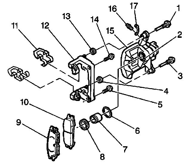 1. Install the caliper (3) over the rotor (4) and the caliper bracket (1). Ensure that the bushings are in place.