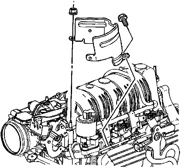 9. Remove the exhaust gas recirculation valve (EGR) wiring harness heat shield nut, bolt and the EGR heat shield.