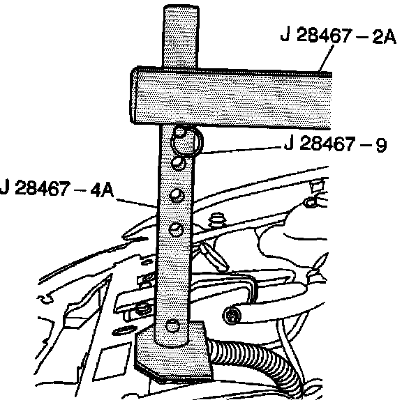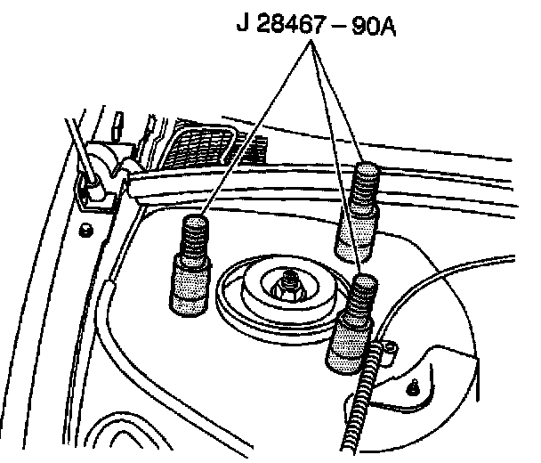 6. Install the strut tower support assemblies J 28467-5A over the J 28467-9OA.