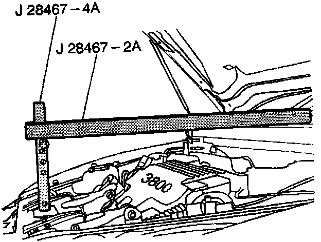 10. Install the radiator shelf tube J 28467-2A on the top of the strut tower tube J 28467-3 on the driver side.
