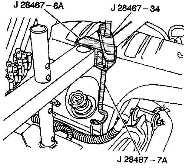 16. Install the assembled lift hook bracket J 28467-6A over the passenger side radiator shelf tube J 28467-2A.