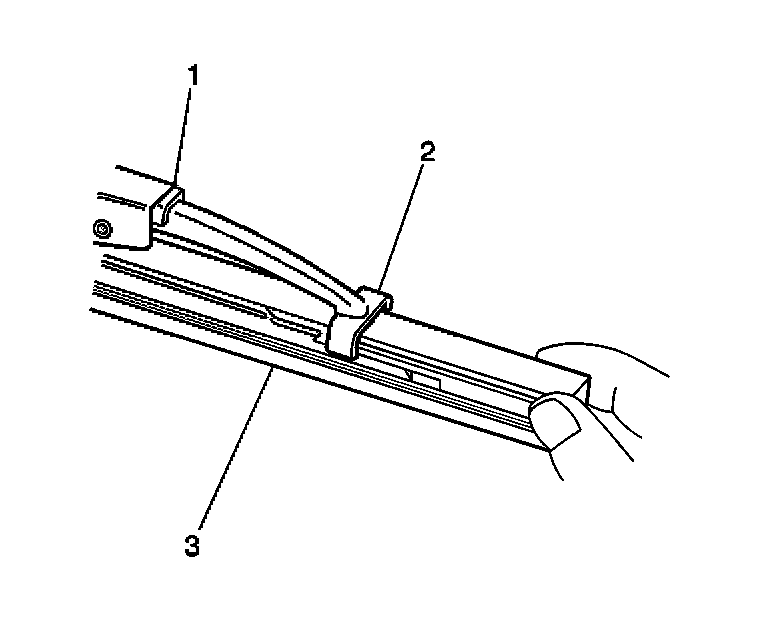 3. Engage the bottom claw (2) of the wiper blade (1) into the notches in wiper blade element (3).