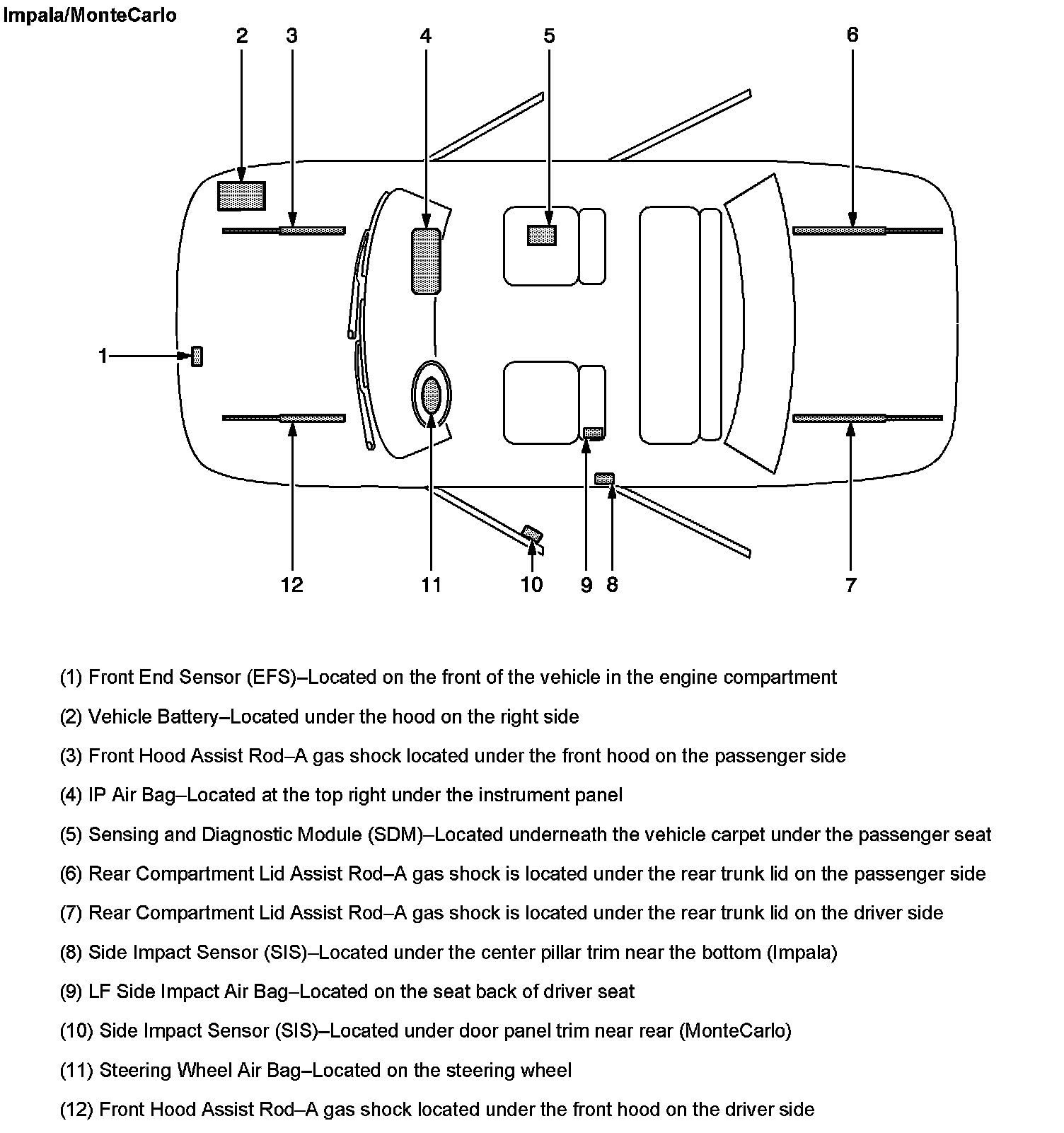 The SIR Zone Identification Views shown below illustrate the approximate location of all SIR components available for the vehicle. This will assist in determining the appropriate SIR Disabling and Enabling Zones for a given service procedure, refer to SIR Disabling and Enabling Zones.