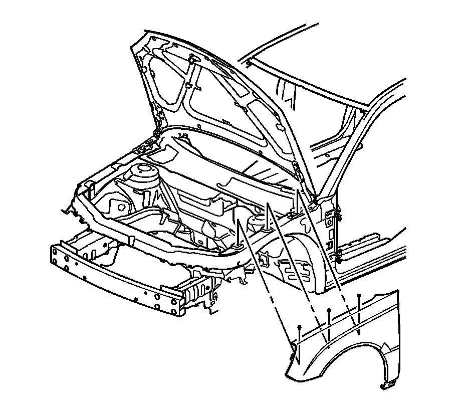 * The bolts which secure the fender flange to the upper compartment side rail.
