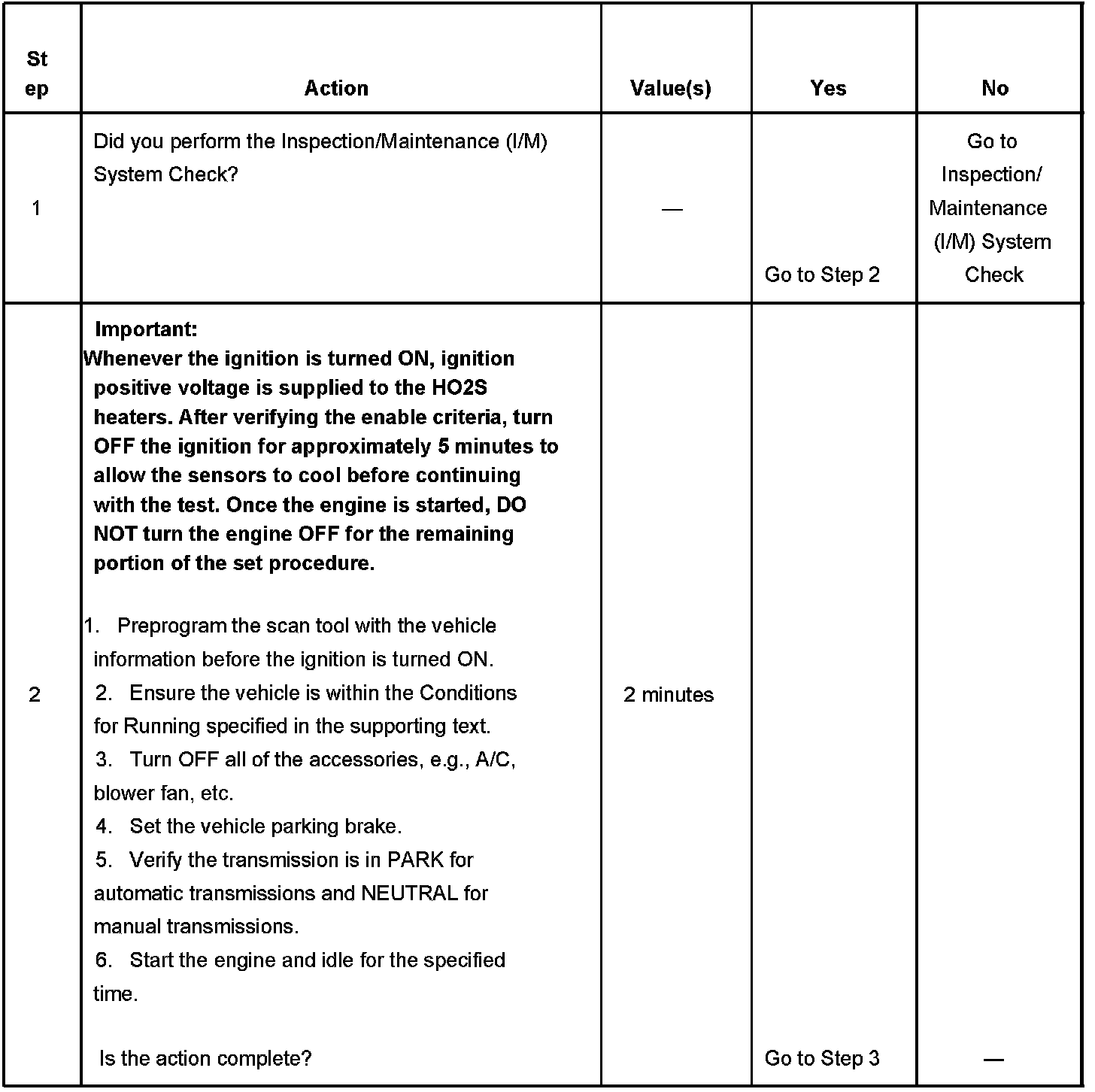 The purpose of the I/M Complete System Set Procedure is to satisfy the enable criteria necessary to execute all of the I/M readiness diagnostics, and complete the drive cycles for those particular diagnostics. When all diagnostic tests are completed, the I/M System Status indicators are set to YES. Perform this procedure when more than one of the I/M System Status indicators are set to NO.