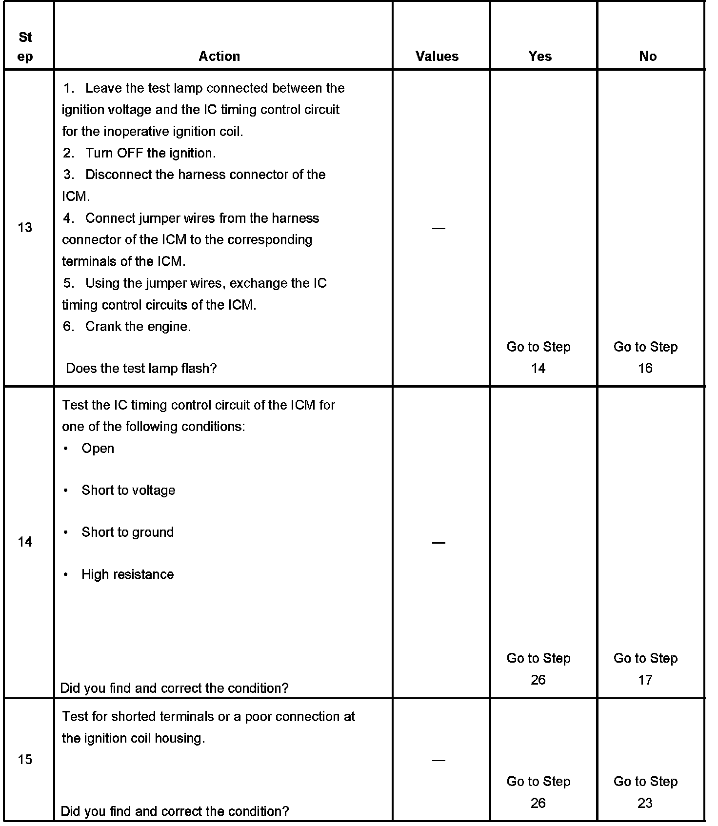 Each ignition coil supplies secondary voltage to a pair of spark plugs. This is called a waste spark ignition system. The powertrain control module (PCM) supplies a signal on each of the ignition control (IC) timing circuits to the ignition control module (ICM). The ICM fires the correct ignition coil at the correct time based on the signals. The ICM detects if cylinder 1 or cylinder 3 is on the compression stroke by sensing the secondary voltage and polarity of each side of the ignition coil. The ICM detects this voltage with sensing circuitry integrated into each ignition coil. The higher voltage is on the compressing cylinder.