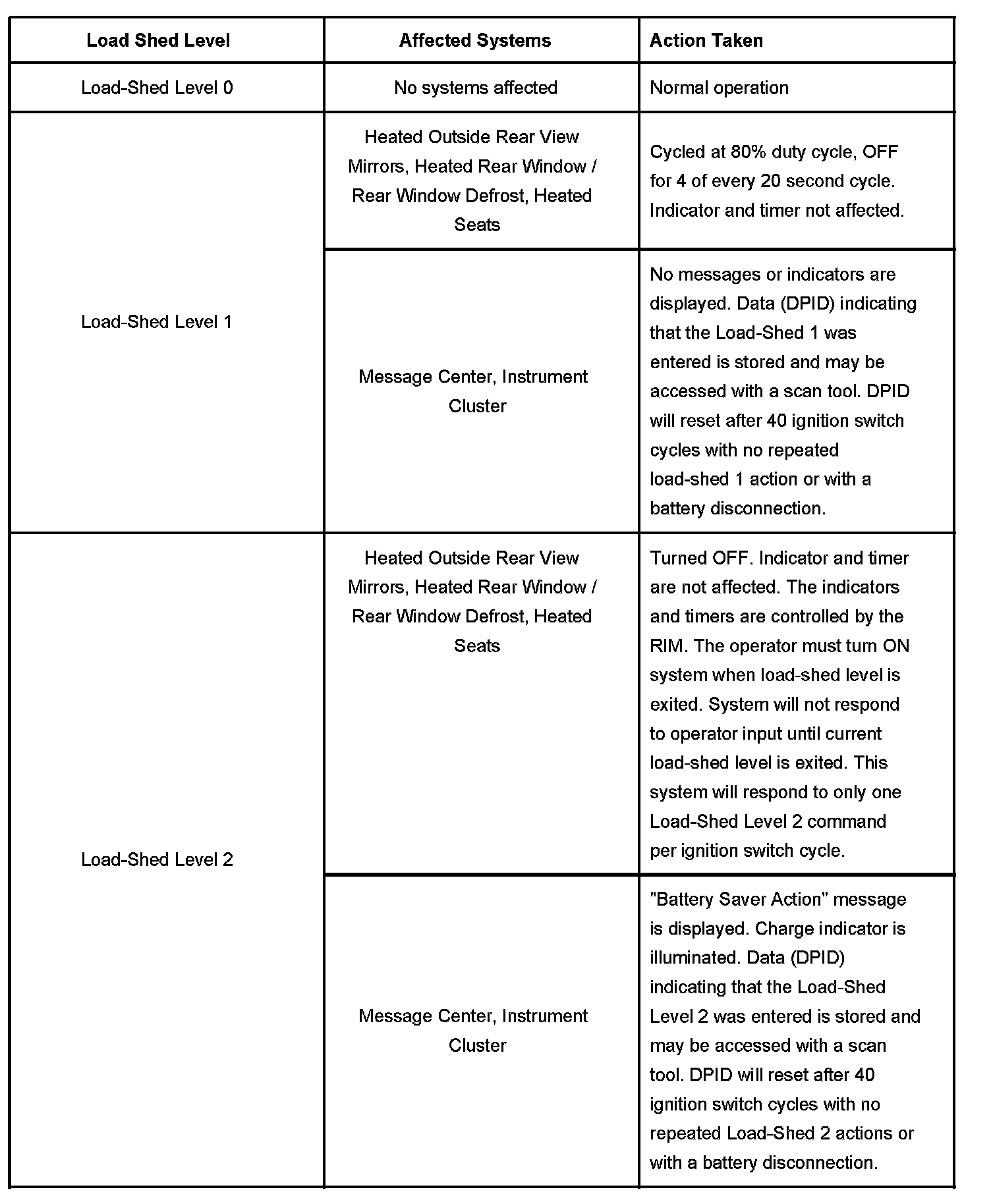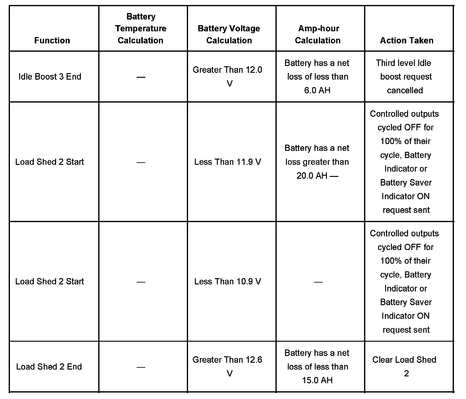 When the EPM algorithm is running, the DIM calculates the net charge rate on the electrical system by making constant voltage measurements. It uses the measurements to calculate the charge rate in amp/hours. If the DIM detects a negative charge rate, equal to a discharge from the battery, EPM can request up to 3 levels of idle boost from the ECM, when the vehicle is in park or neutral, as well as up to 2 levels of load shedding for a total of 5 levels of corrective action to maintain proper vehicle electrical system operation.