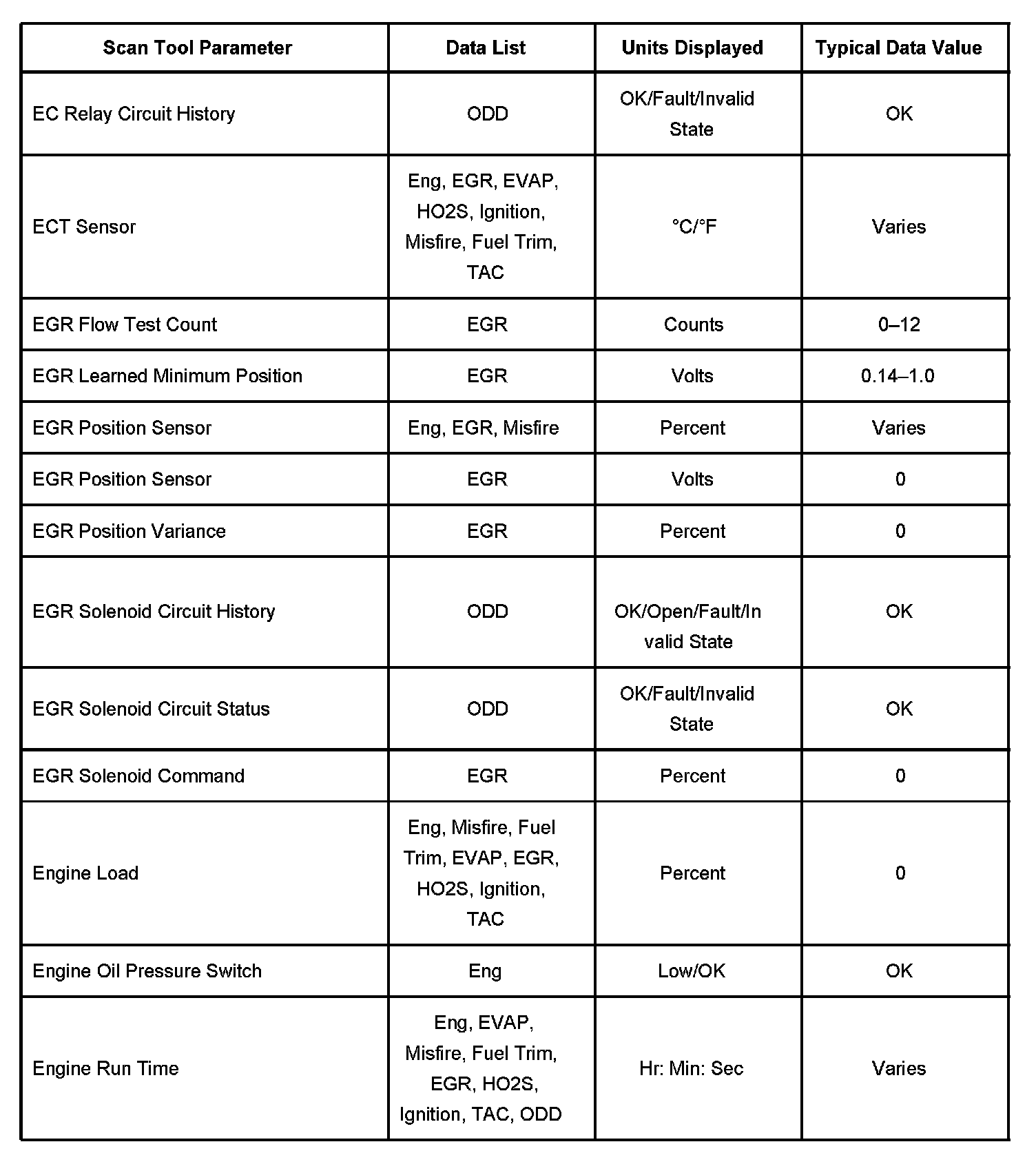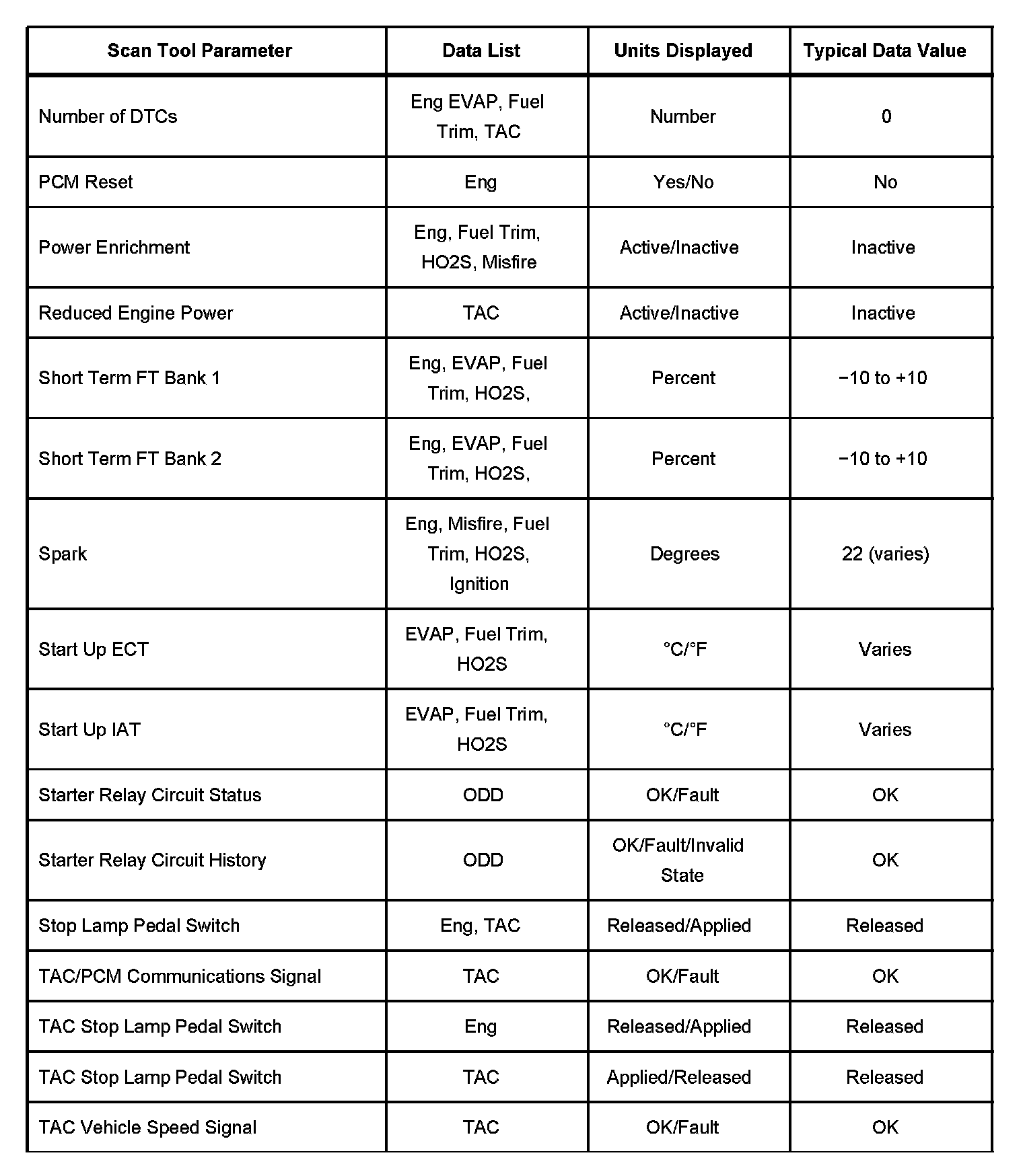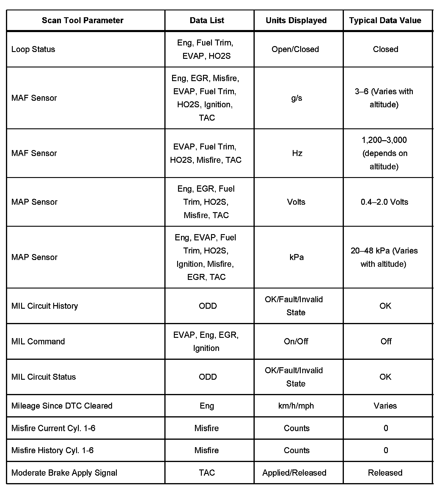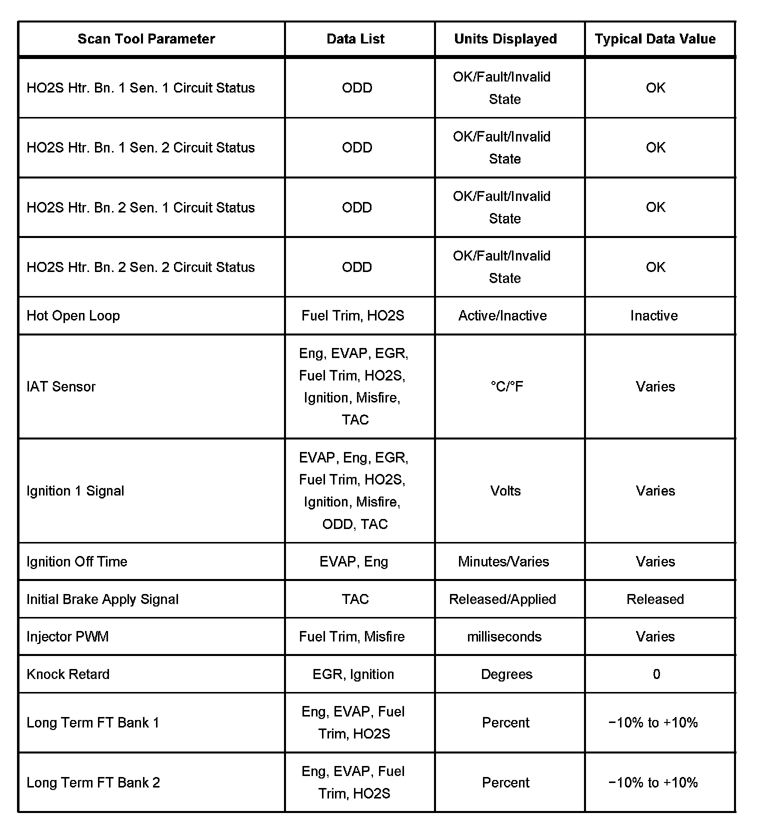 The column labeled Data List indicates where a parameter can be located on the scan tool. Refer to the scan tool operating manual for the exact locations of the data lists. The following is a description of each term listed: