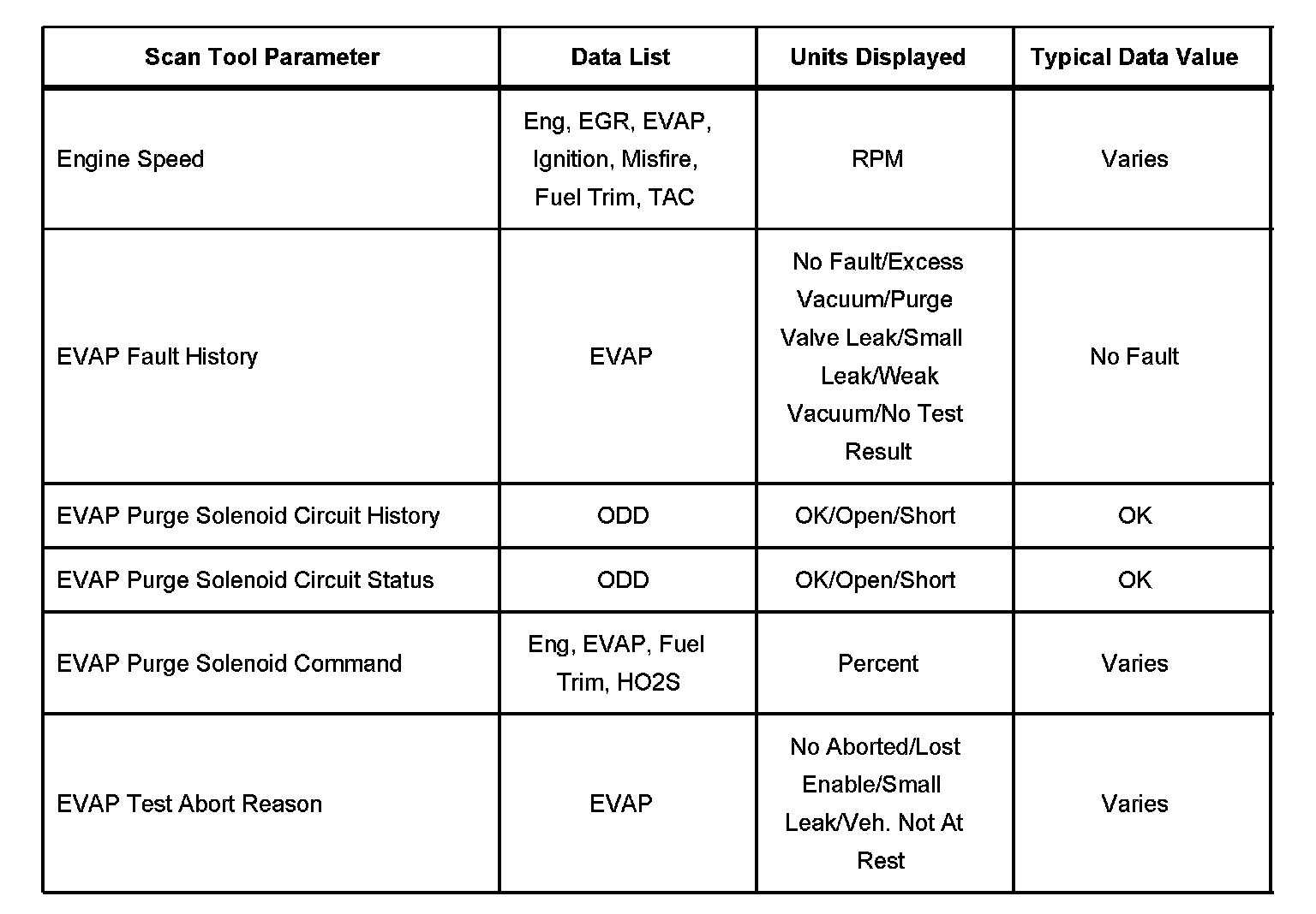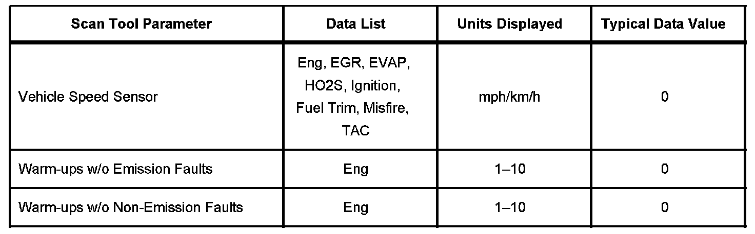 SCAN TOOL DATA LISTThe Engine Scan Tool Data List contains all engine-related parameters that are available on the scan tool. The list is arranged in alphabetical order. A given parameter may appear in any one of the data lists, and in some cases may appear more than once, or in more than one data list in order to group certain related parameters together.
