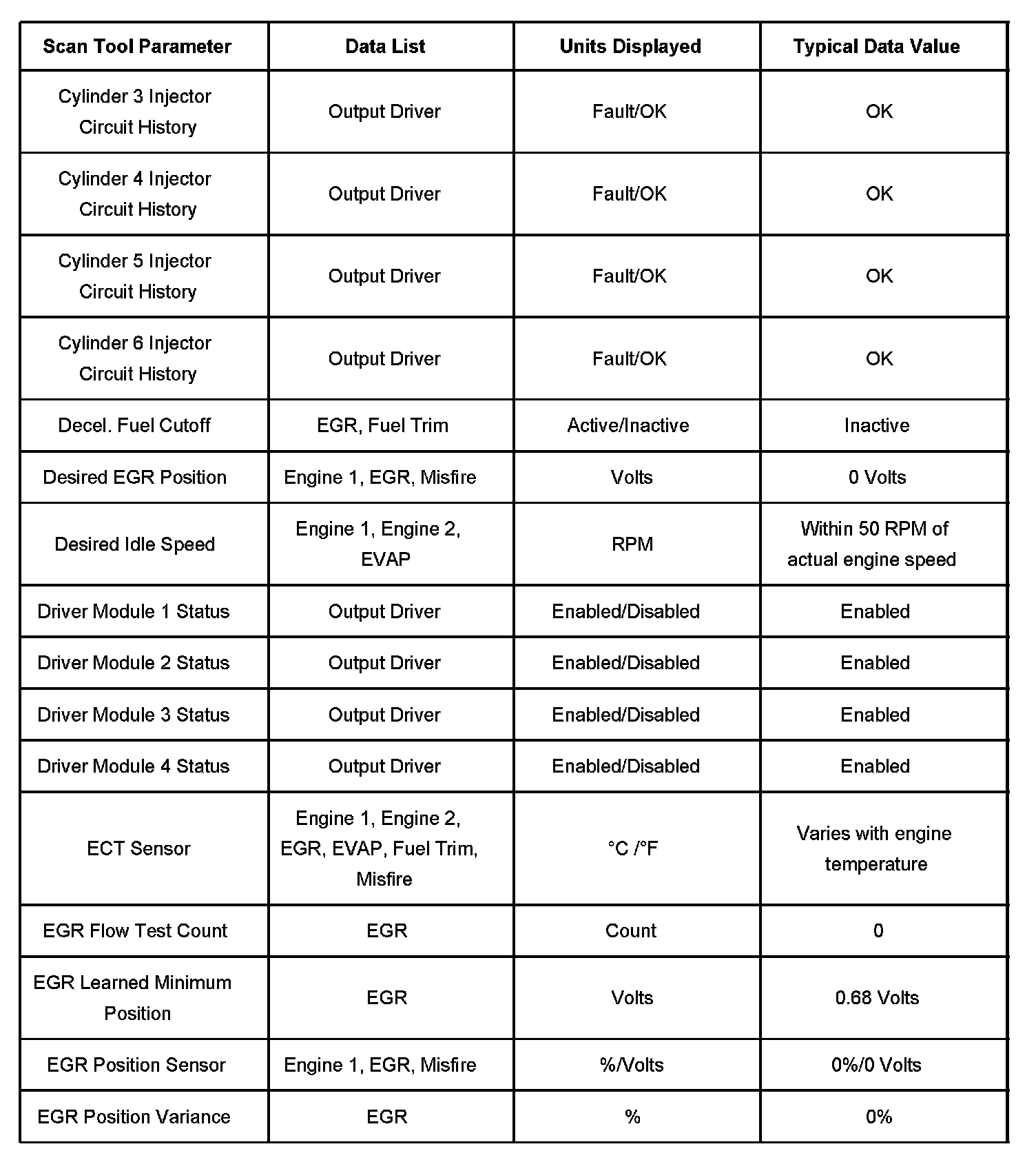 - Exhaust gas recirculation (EGR) Data-Contains information specific to the EGR system. This list displays parameters required to verify proper EGR system operation