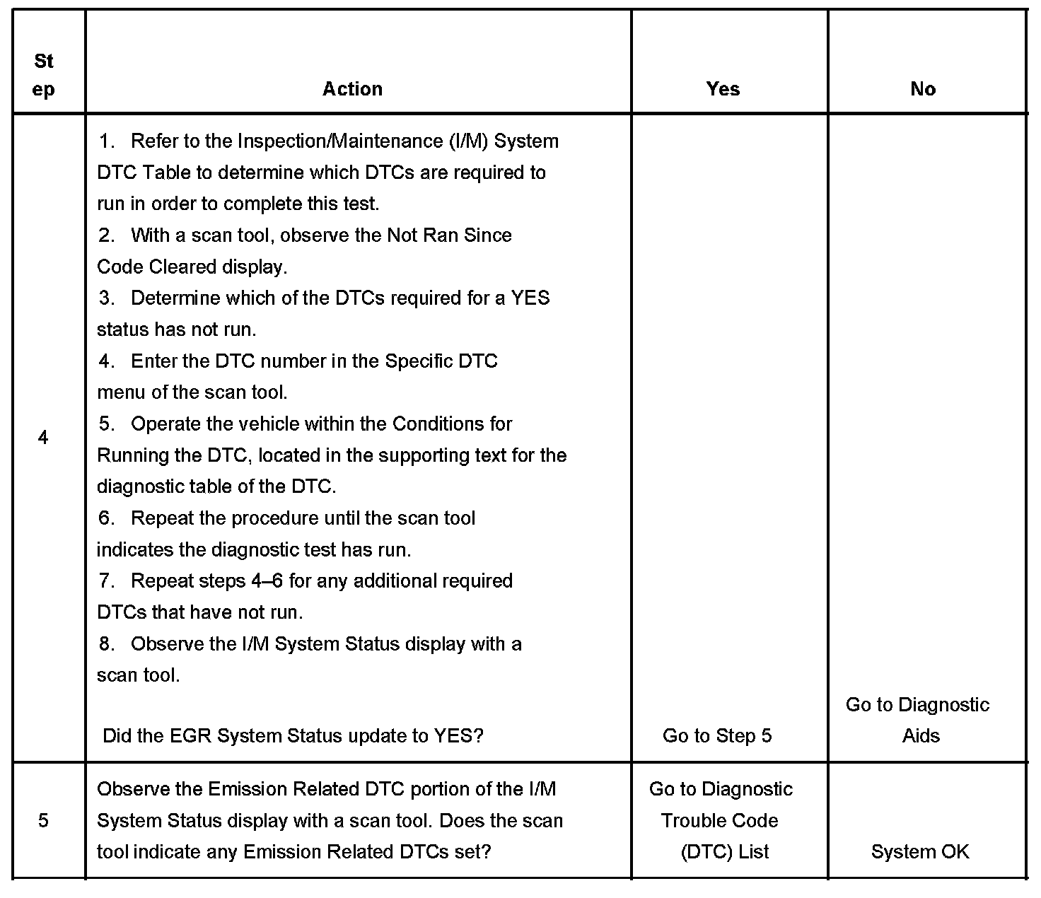 The purpose of this test is to satisfy the enable criteria necessary to execute inspection/maintenance (I/M) readiness diagnostics for the exhaust gas recirculation (EGR) system. The test may be used to set the I/M System Status indicators to YES. The I/M System Status display on the scan tool provides an indication of whether the control module has completed the required tests. The I/M System Status does not indicate that the tests have passed or failed. When all of the diagnostics for a specific system have run and passed, the I/M System Status will update to YES. If a test for a specific system has failed, the I/M System Status will update to YES, indicating a determination was made even if all of the other tests for that system have not run.