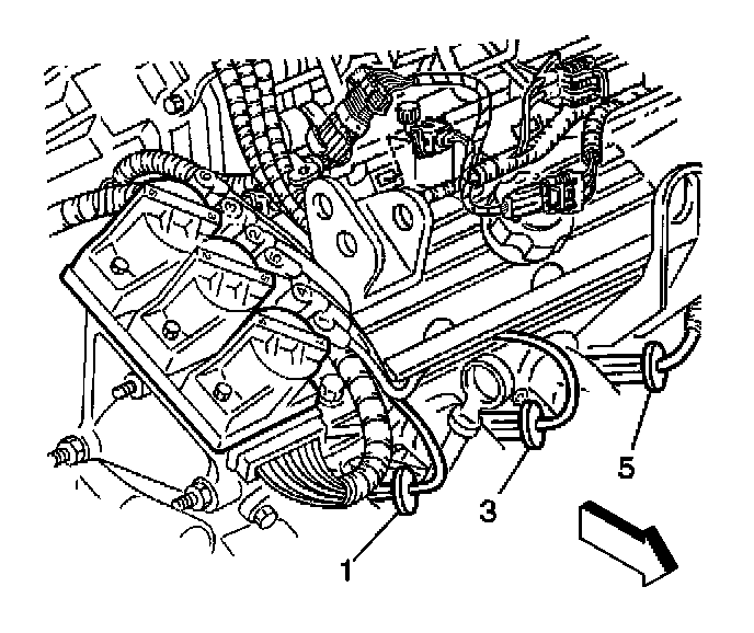 4. Install the spark plug wires (1, 3, 5) to the spark plugs in the proper position at the front of the engine.
