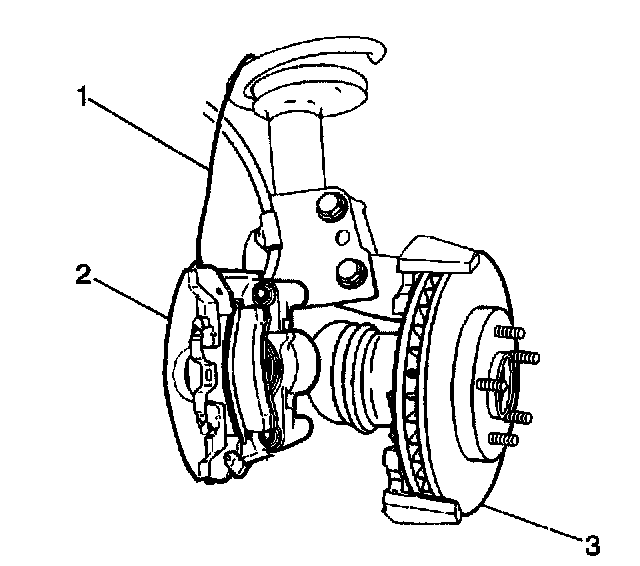 6. Remove the brake caliper with brake pads as an assembly (2) from the steering knuckle and support the assembly with heavy mechanic's wire (1), or equivalent. Ensure that there is no tension on the hydraulic brake flexible hose.