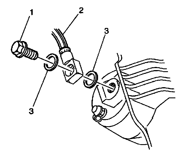 5. Install the brake hose to caliper bolt (1) with 2 new copper washers (3) and the brake hose (2) to the caliper.