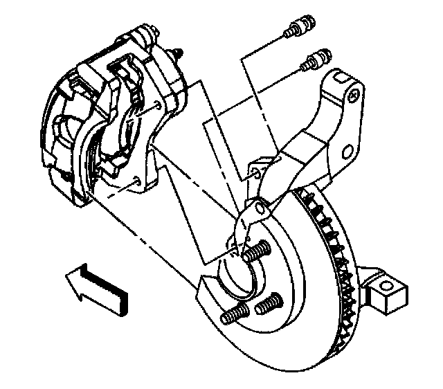 Notice: Support the brake caliper with heavy mechanic's wire, or equivalent, whenever it is separated from it's mount and the hydraulic flexible brake hose is still connected. Failure to support the caliper in this manner will cause the flexible brake hose to bear the weight of the caliper, which may cause damage to the brake hose and in turn may cause a brake fluid leak.