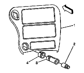 3. Remove the cigar lighter housing (4) by placing one side of the "T" portion of J 42059 (3) into the tab opening inside the housing. Angle the other side of J 42059 into the other tab opening inside the housing.Remove the housing by pulling the tool rearward from the I/P trim plate (1).