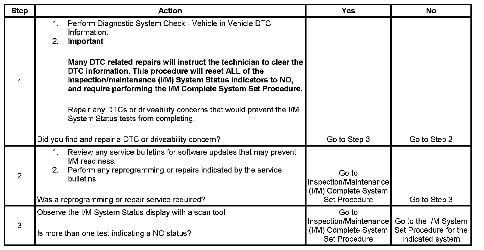 For the specific DTCs required for each system, refer to Inspection/Maintenance (I/M) System DTC Table. Systems such as fuel delivery, misfire, and comprehensive components may not be listed in a system status list. These tests run continuously and do not require an I/M System Status indicator. Inspection/Maitenance (I/M) System (DTC) Table