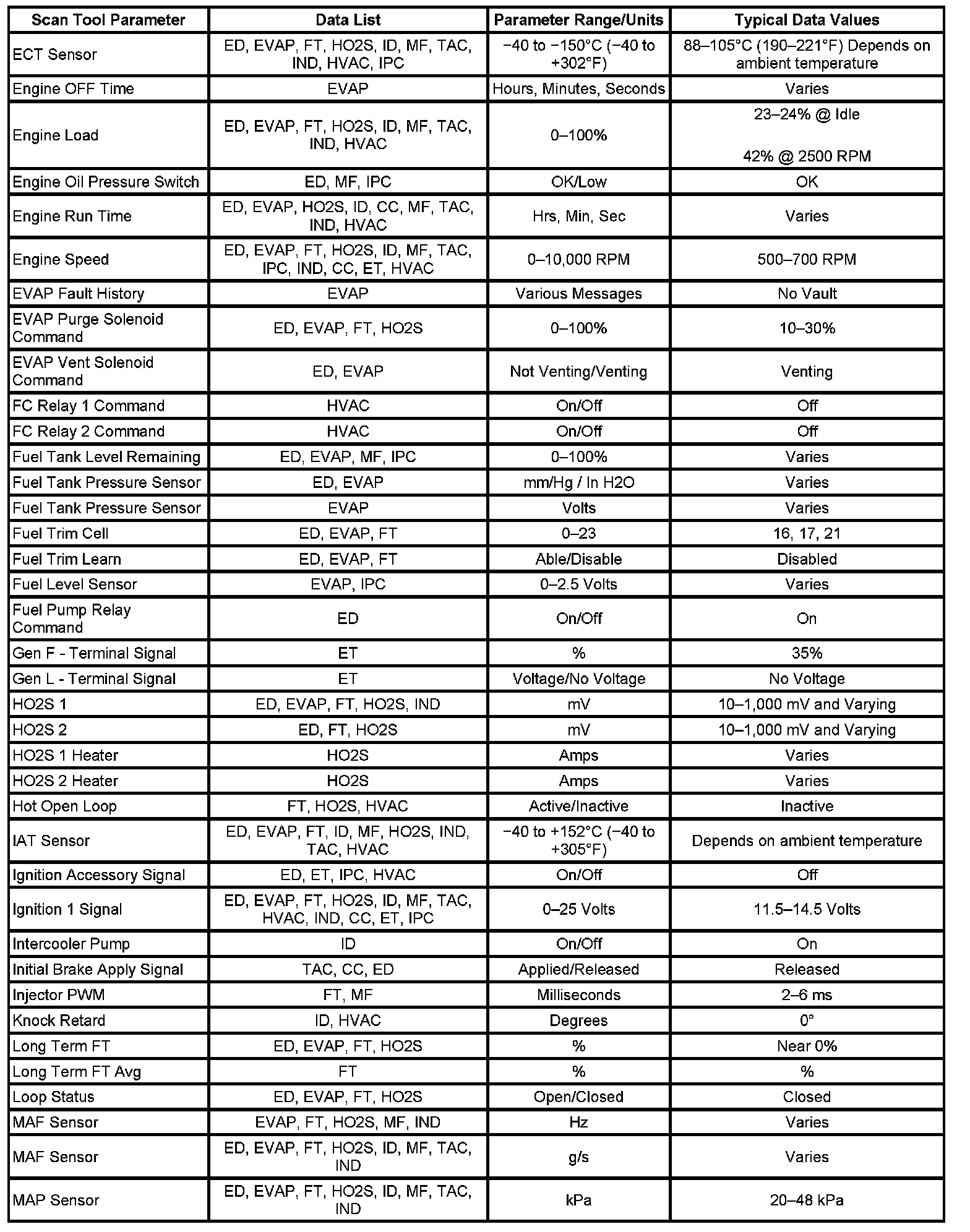 The Engine Scan Tool Data List contains all engine related parameters that are available on the scan tool. The list is arranged in alphabetical order. A given parameter may appear in any one of the data lists, and in some cases may appear more than once, or in more than one data list in order to group certain related parameters together.