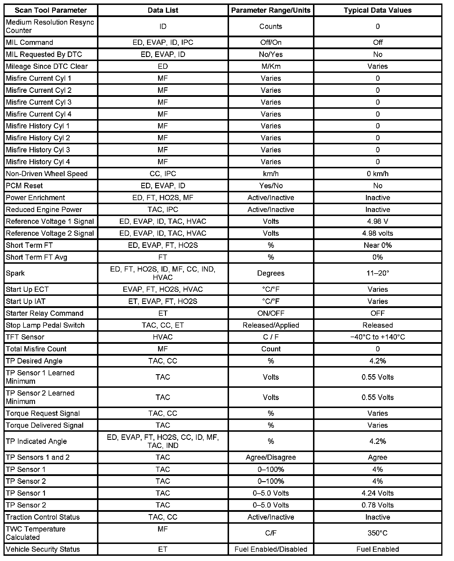 The column labeled Data List indicates where a parameter can be located on the scan tool. Refer to the scan tool operating manual for the exact locations of the data lists. The following is a description of each term listed: