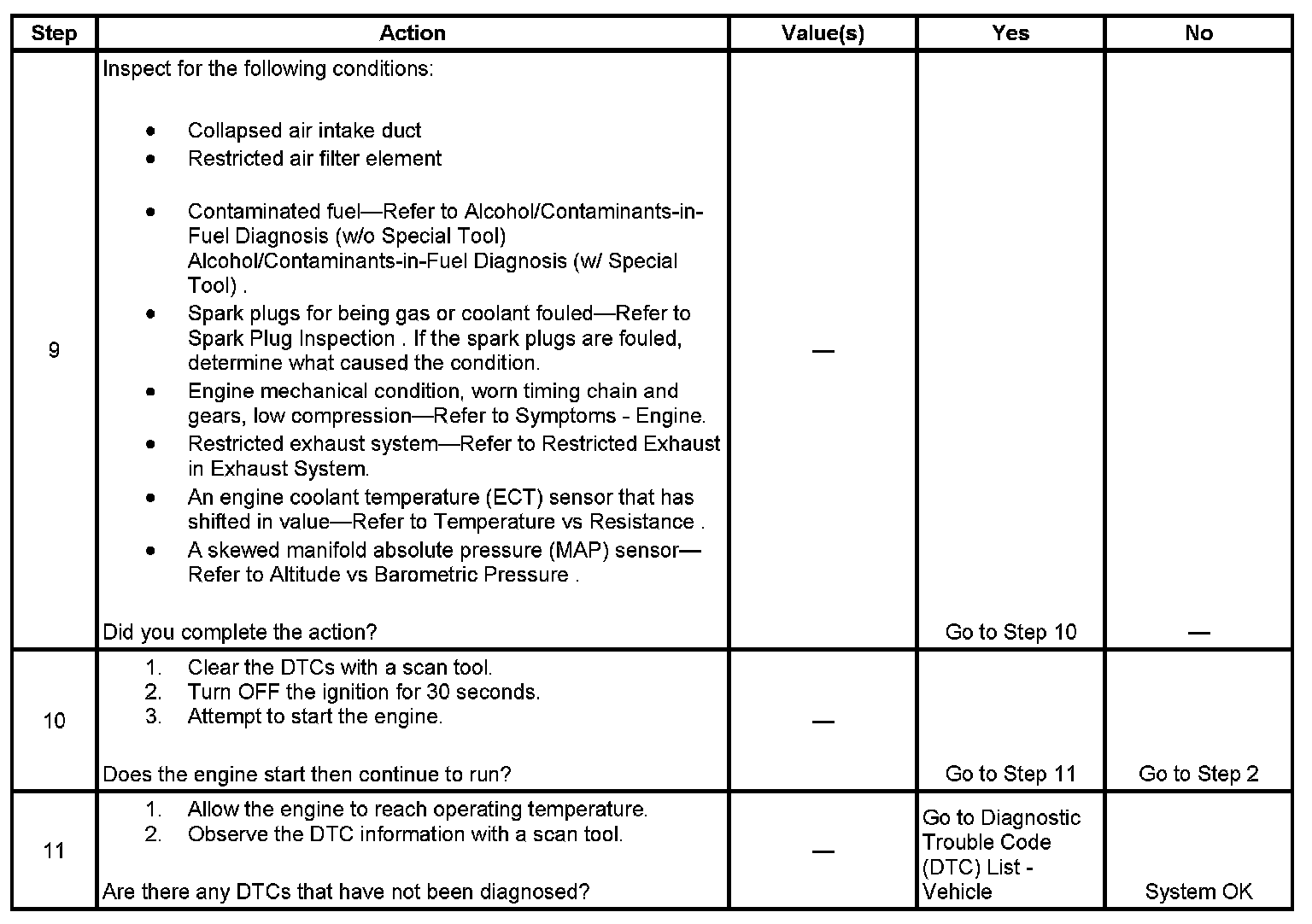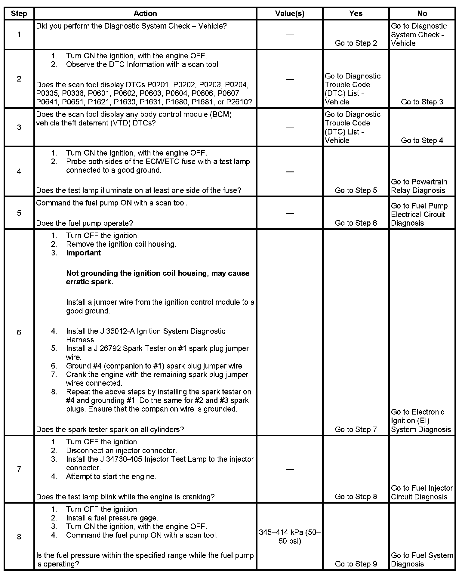 The Engine Cranks but Does Not Run diagnostic table is an organized approach to identifying a condition that causes an engine not to start. The Engine Cranks but Does Not Run diagnostic table directs the service technician to the appropriate system diagnosis.
