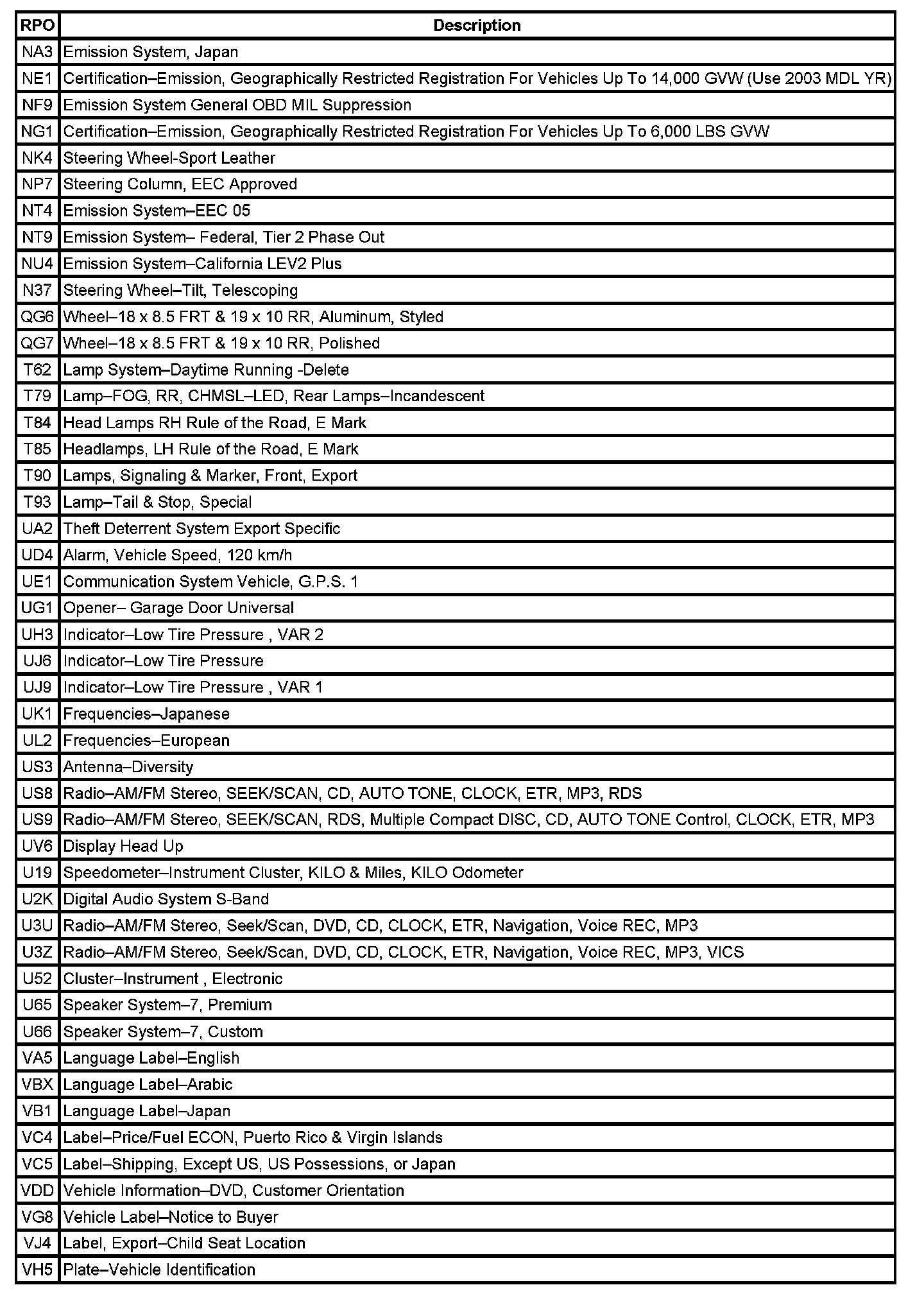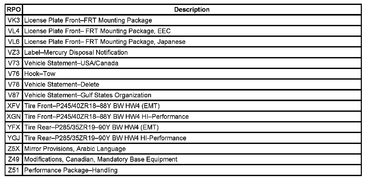RPO Code List Part 1: