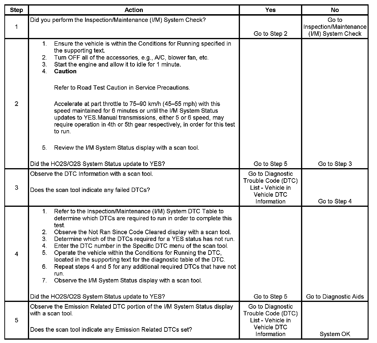 The purpose of this test is to satisfy the enable criteria necessary to execute inspection/maintenance (I/M) readiness diagnostics for the oxygen sensor (O2S, HO2S) system. The test may be used to set the I/M System Status to YES. The I/M System Status display on the scan tool provides an indication of whether the control module has completed the required tests. The I/M System Status does not indicate that the tests have passed or failed. When all of the diagnostics for a specific system have run and passed, the I/M System Status will update to YES. If a test for a specific system has failed, the I/M System Status will update to YES, indicating a determination was made, even if all of the other tests for that system have not run.