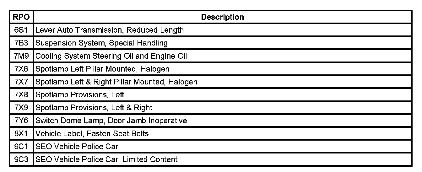 The table provides the description of the Regular Production Option (RPO) codes that are available on the vehicle. The vehicle's RPO list is printed on the Service Parts Identification Label.