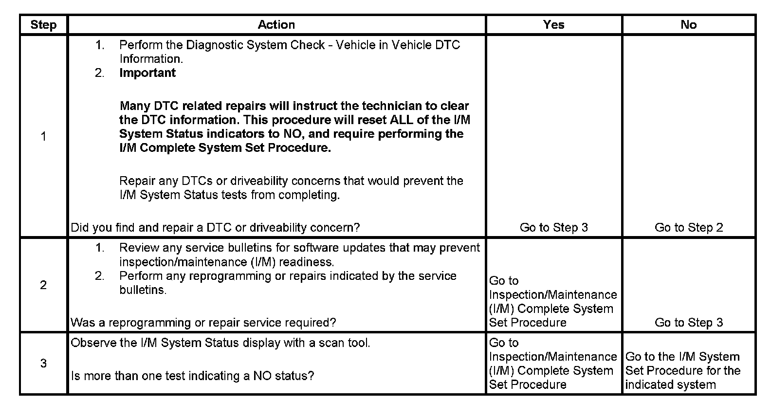 For the specific DTCs required for each system, refer to Inspection/Maintenance (I/M) System DTC Table. Systems such as fuel delivery, misfire, and comprehensive components may not be listed in a system status list. These tests run continuously and do not require an I/M System Status indicator. Inspection/Maitenance (I/M) System (DTC) Table