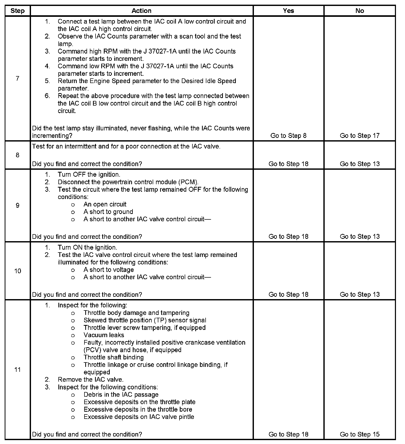 7. This test will determine the ability of the PCM to provide the IAC control valve circuits with a ground. On a normally operating system, the test lamp should not flash while the IAC Counts are incrementing.