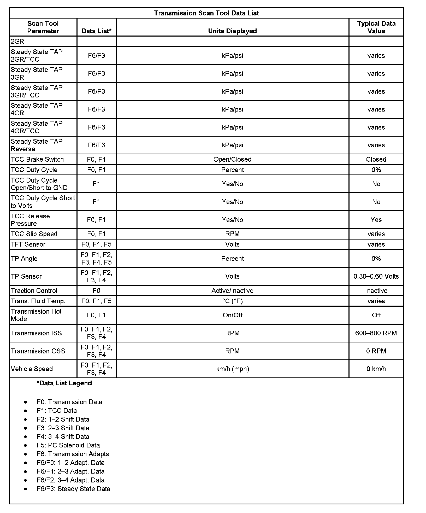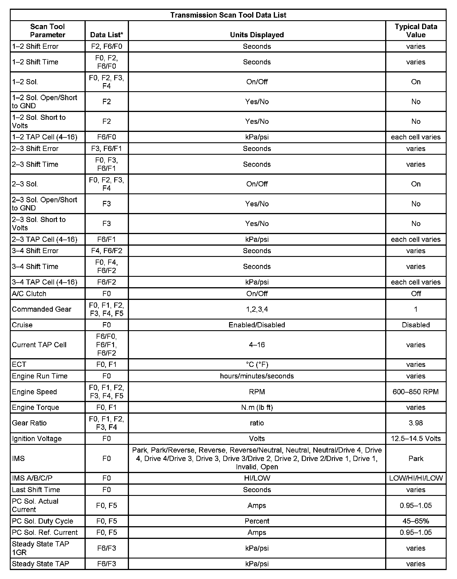 Transmission Scan Tool Data List