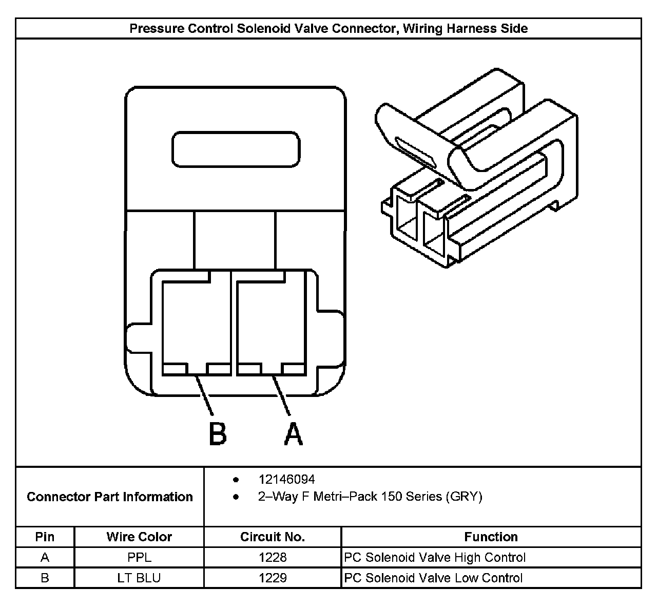 Pressure Control Solenoid Valve Connector End View, Wiring Harness Side: