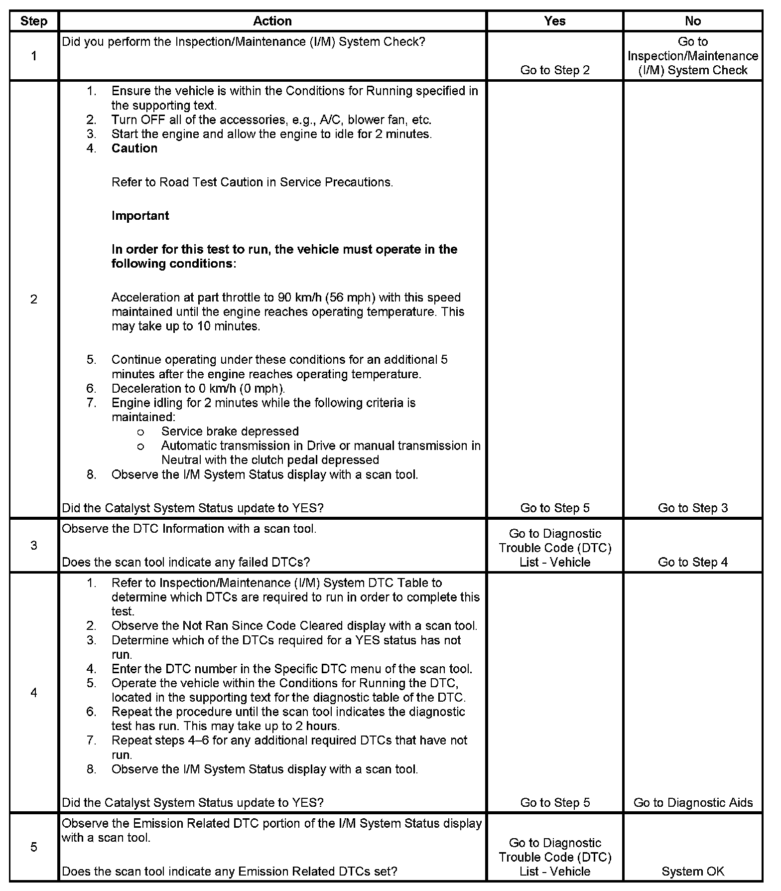 The purpose of this test is to satisfy the enable criteria necessary to execute inspection and maintenance (I/M) readiness diagnostics for the catalyst system. The test may be used to set the I/M System Status indicators to YES. The I/M System Status Display on the scan tool provides an indication of whether the control module has completed the required tests. I/M System Status does not indicate that the tests have passed or failed. When all of the diagnostics for a specific system have run and passed I/M System Status will update to YES. If a test for a specific system has failed, the I/M System Status will update to YES, indicating a determination was made, even if all of the other tests for that system have not run.