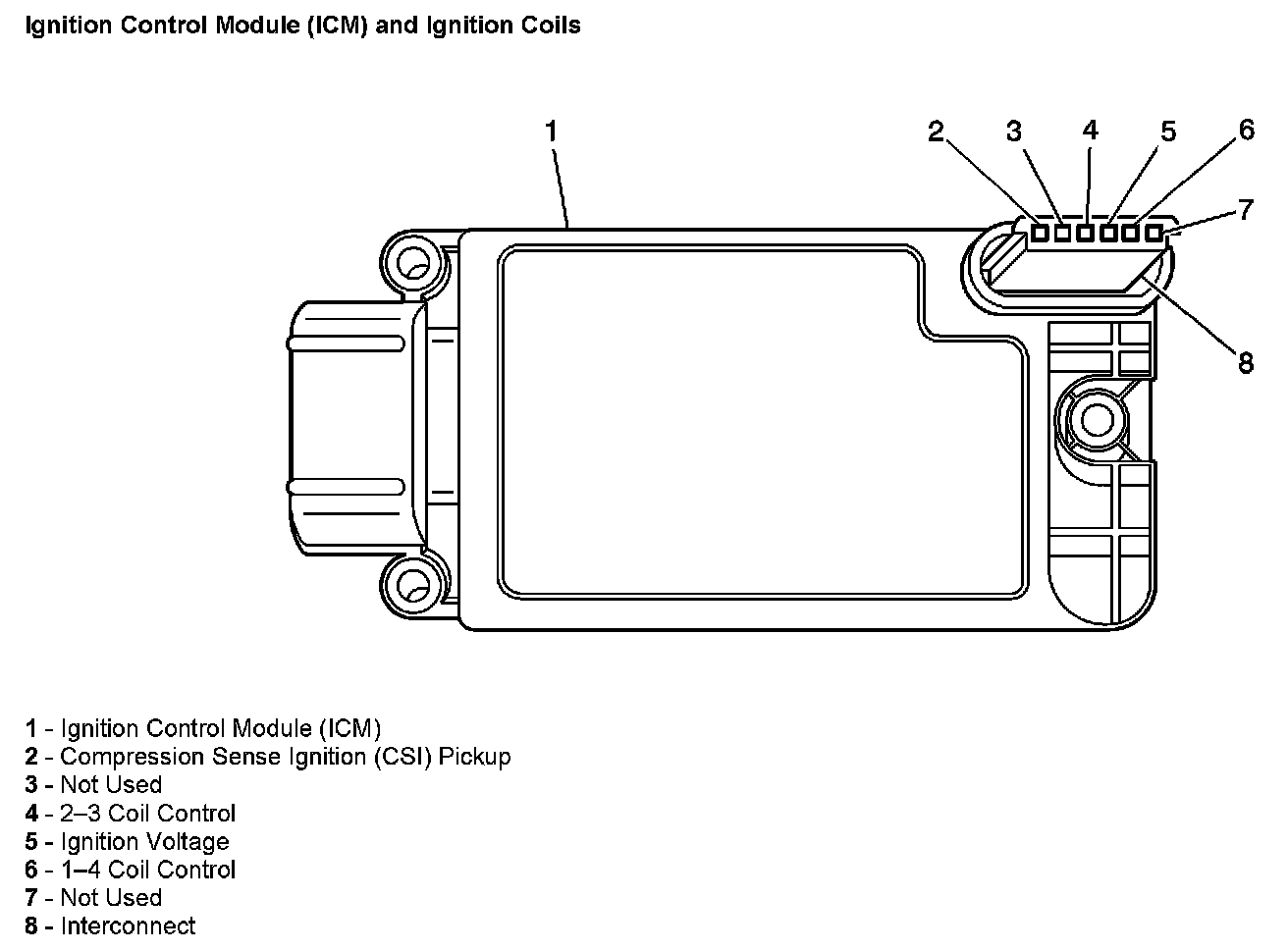 The powertrain control module (PCM) supplies a signal on each of the ignition control (IC) timing control circuits to the ignition control module (ICM). The ICM fires the correct ignition coil at the correct time based on the signals. The ICM detects if cylinder 1 or cylinder 3 is on the compression stroke by sensing the secondary voltage and polarity of each side of the ignition coil. The ICM detects this voltage with sensing circuitry integrated into each ignition coil. The higher voltage is on the compressing cylinder. This is called compression sense ignition. The ICM provides a synthesized cam signal to the PCM based on these inputs. The PCM uses the cam signal to synchronize fuel injection.