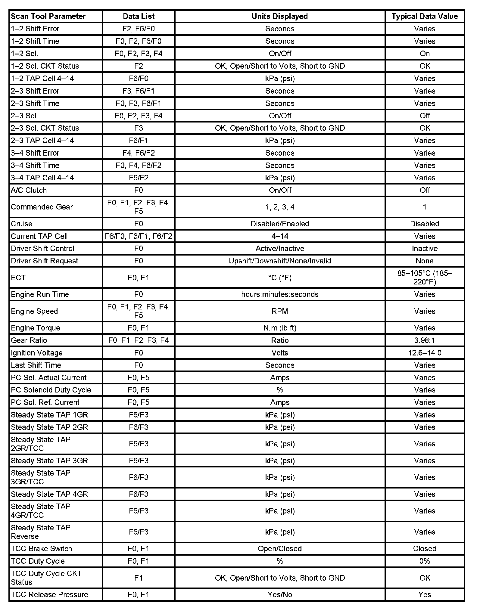 Only the parameters listed below are used in this manual for diagnosing. If a scan tool displays other parameters, the values are not recommended by General Motors for use in diagnosis.